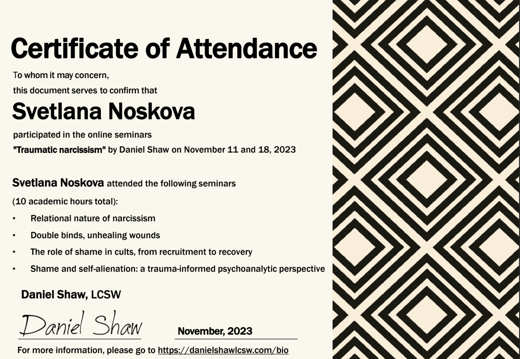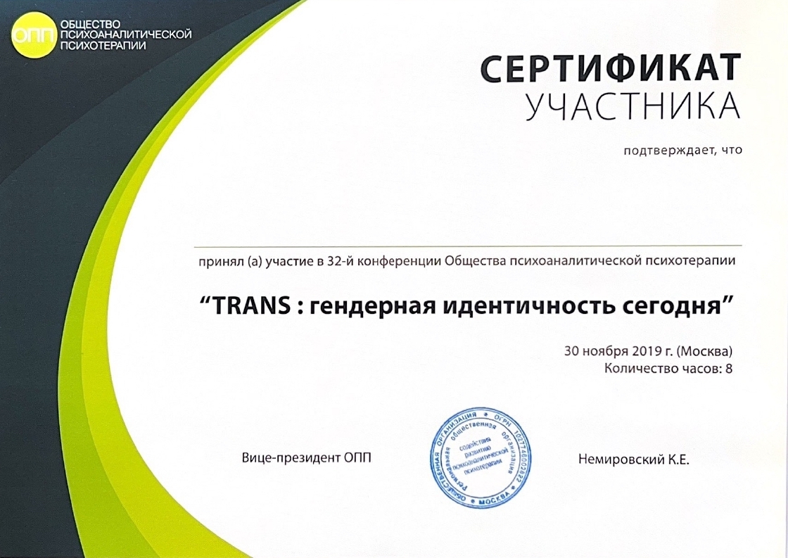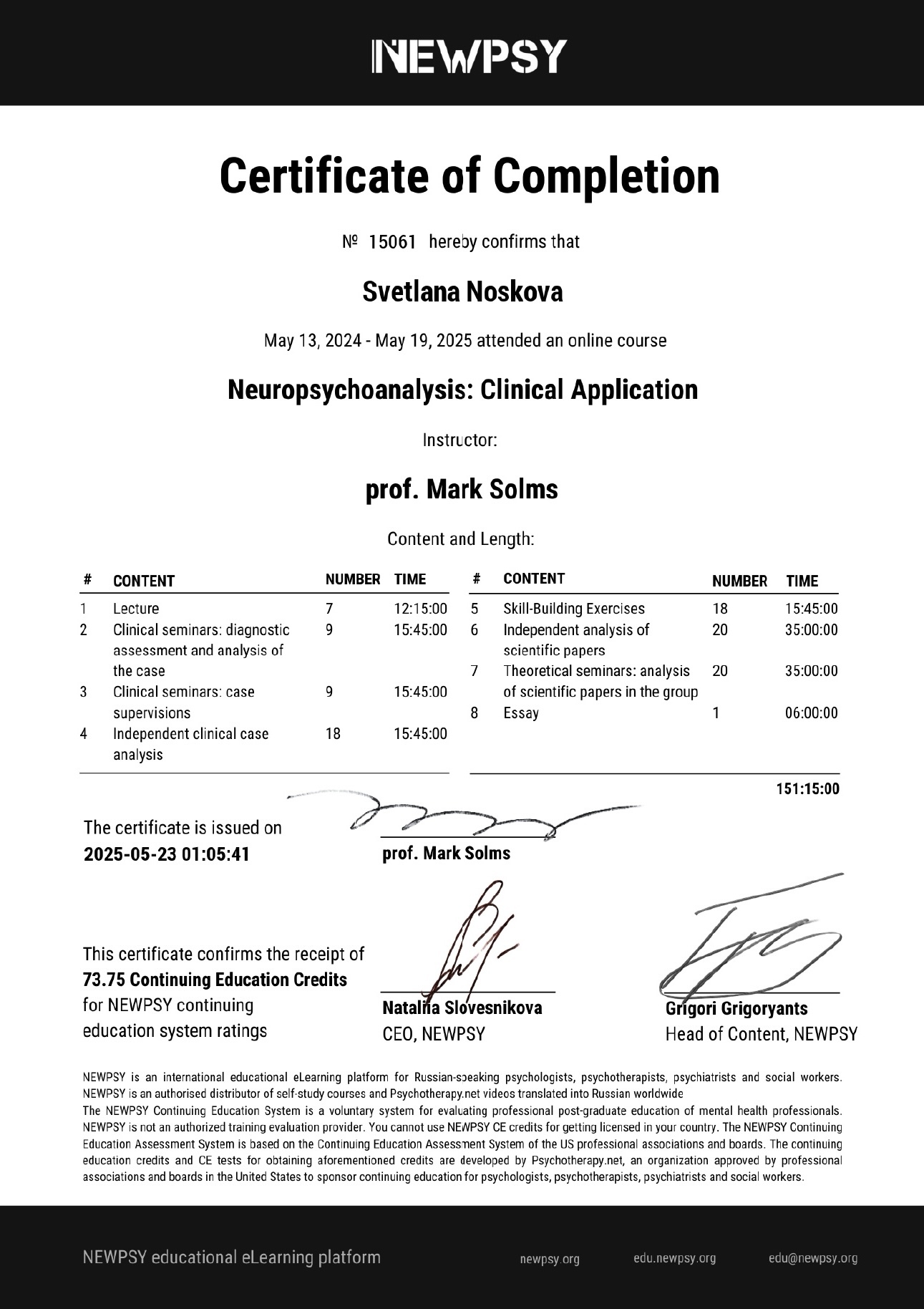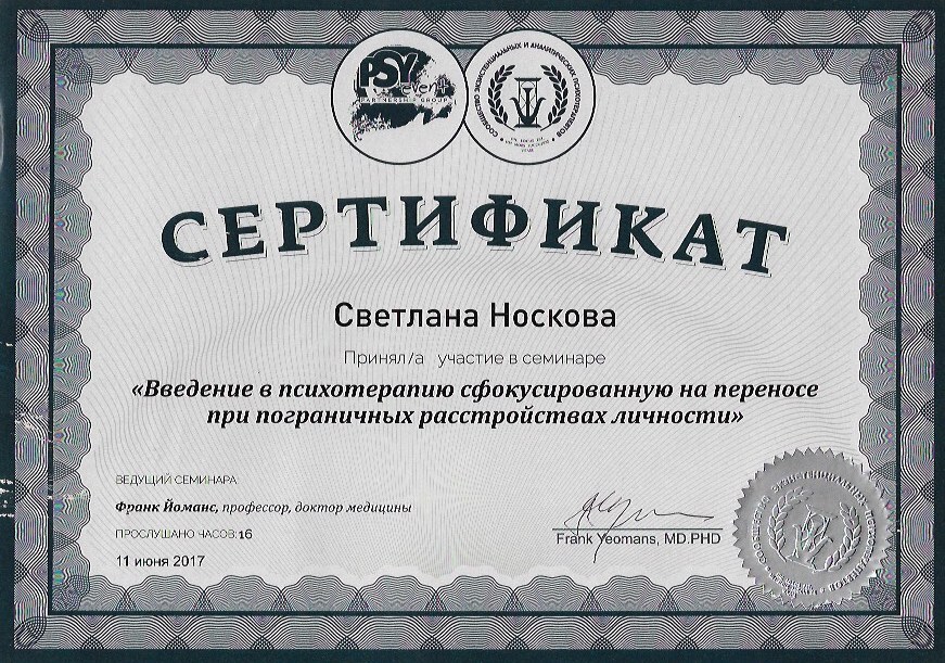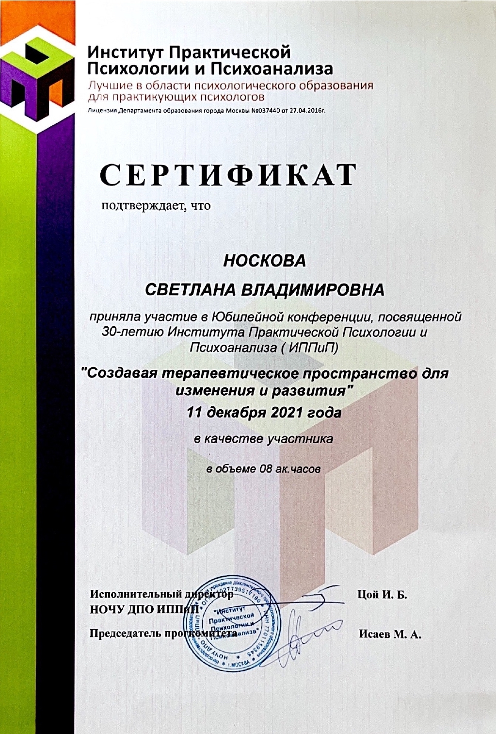 Более 7 лет активной практики, постоянные супервизии и личная терапия — часть моей профессиональной гигиены и ответственности перед пациентами.